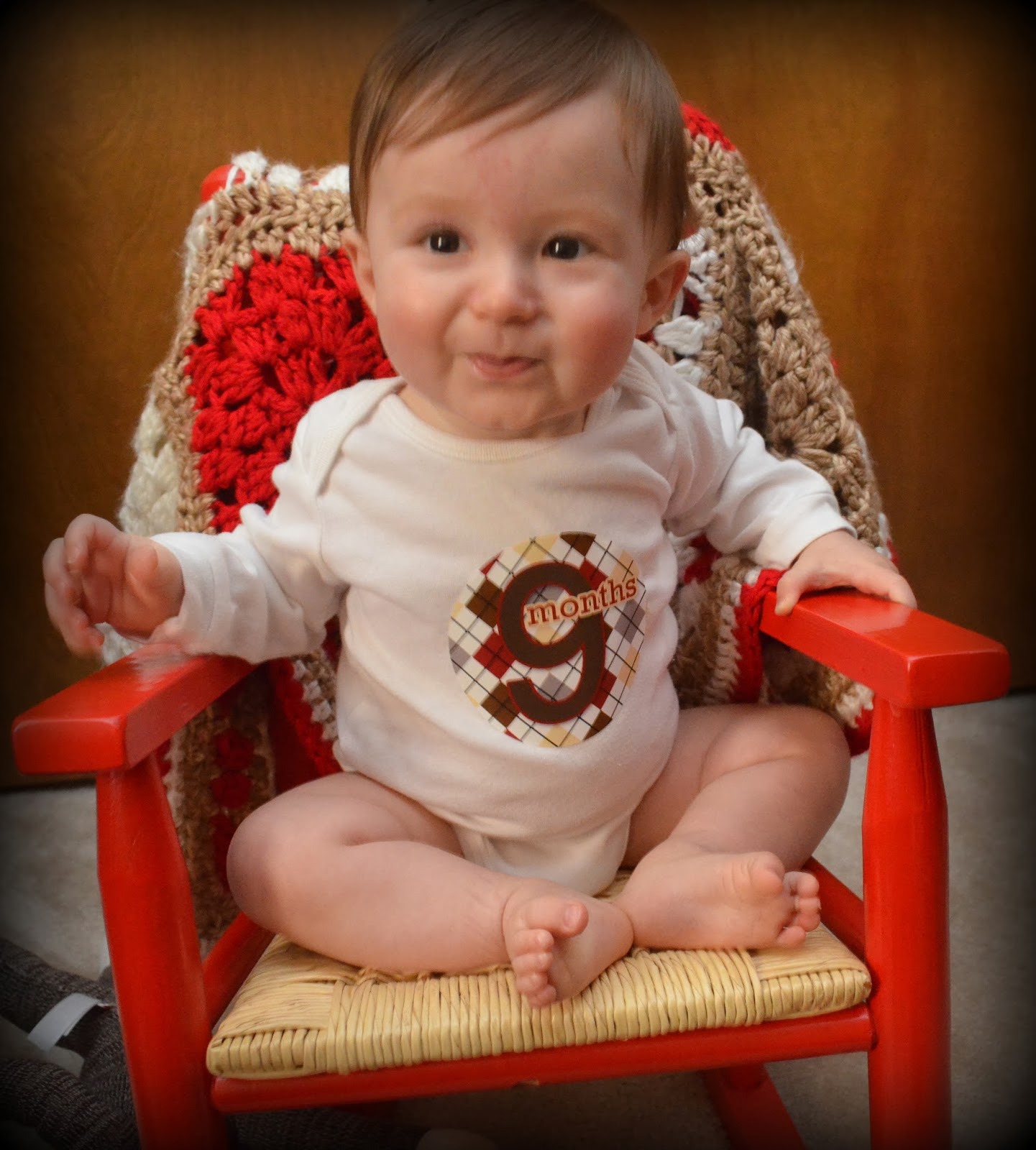every day. He is not crawling yet, but very close. Apparently we all crawl and walk late in our family. He loves to wave hello to everyone and gives high fives. He makes kissing, puckering sounds with his mouth in response to kisses. He fusses now when I have to take something away from him. He's had peanut butter, fish and lobster and no allergic reactions so far! Whew! He's still waking once a night to nurse, usually in the wee hours of the morning. Still no teeth, so I figure he'll be one of those late blooming boys who doesn't loose their teeth until third grade. Fine with me, because I learned that means later puberty, meaning possibly taller in the long run. Whatever it is, however God made him, he is just perfect!